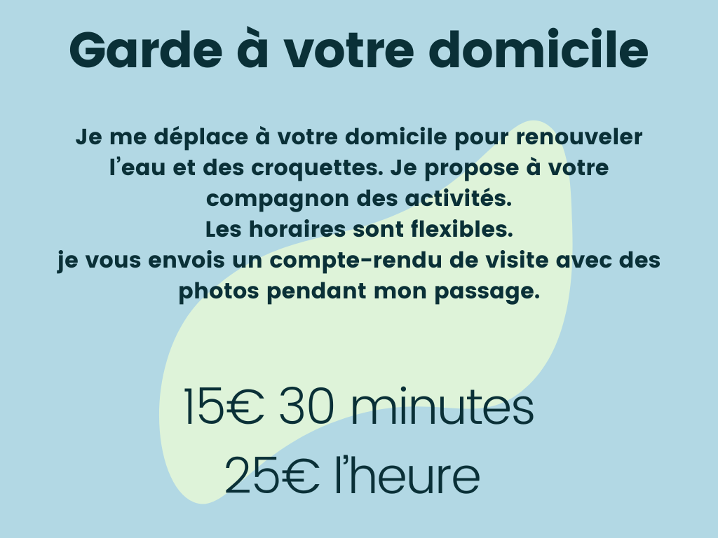 Bilan 2h 50€ Séance individuelle 1h 45€ Balade solo 1h 25€ Balade sensible 1h 30€ Balade sociale 1h30 10€ Balade collective 1h 20€ Séance plouf (désensibilisation à l’eau) 1h30 70€ ou 60€ Garde à votre domicile 30 minutes 15€ 1h 24€ 20€ par jour Pension familiale